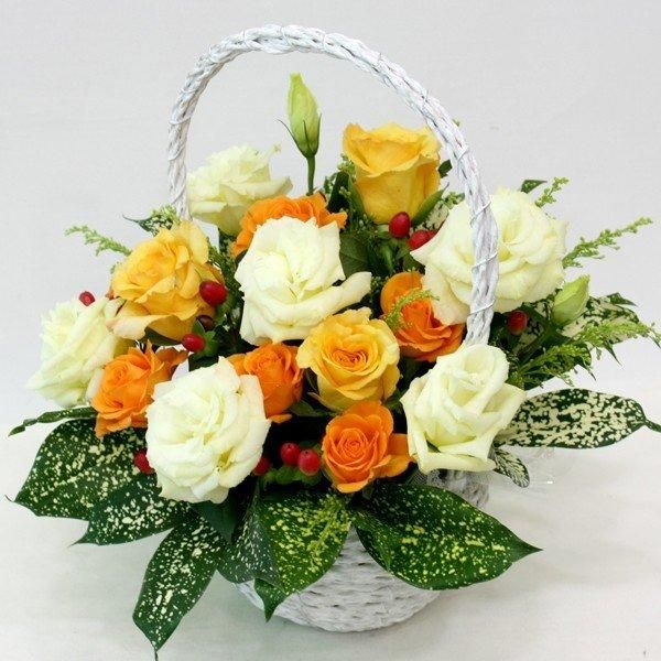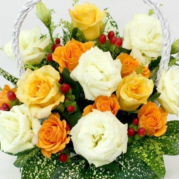 (誕生日・お祝い)バラとトルコキキョウのホワイトバスケット
